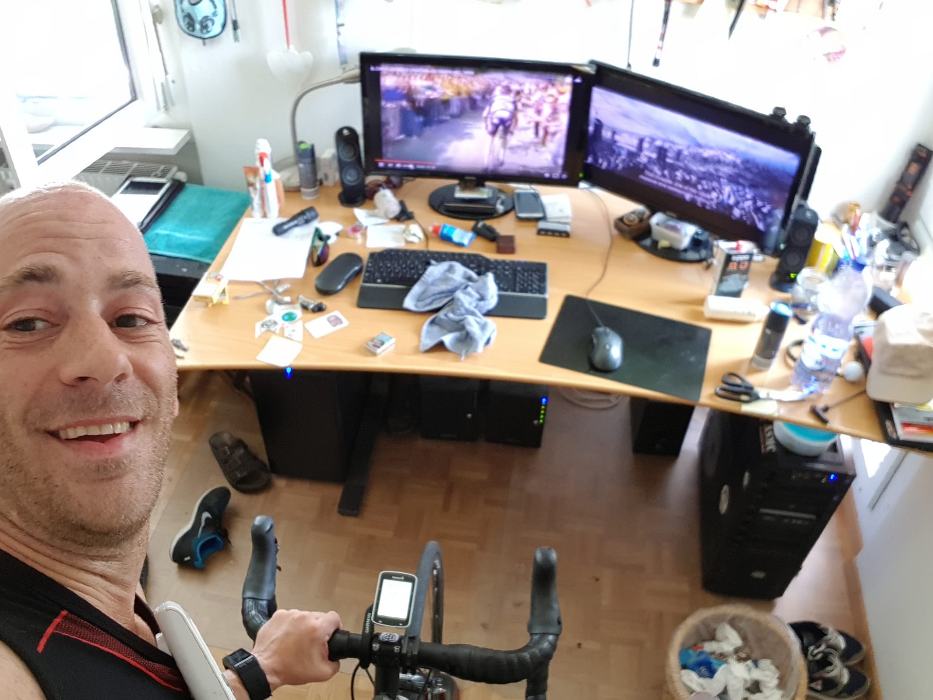 Ich hab einen großen Bürotisch mit einem PC und zwei Bildschirmen und da stelle ich mir meistens was ein. Während der Tour de France zum Beispiel eine Etappe. Sonst gibt es immer noch die Möglichkeit einen Film oder so zu schauen. Als riesengroßer Filme Fan ist das seit dem der Kleine da ist immer wieder mal zu Kurz gekommen. So habe ich die Möglichkeit gleich zwei Fliegen mit einer Klappe zu schlagen. Ich Trainiere und fröne gleichzeitig meiner anderen Leidenschaft.