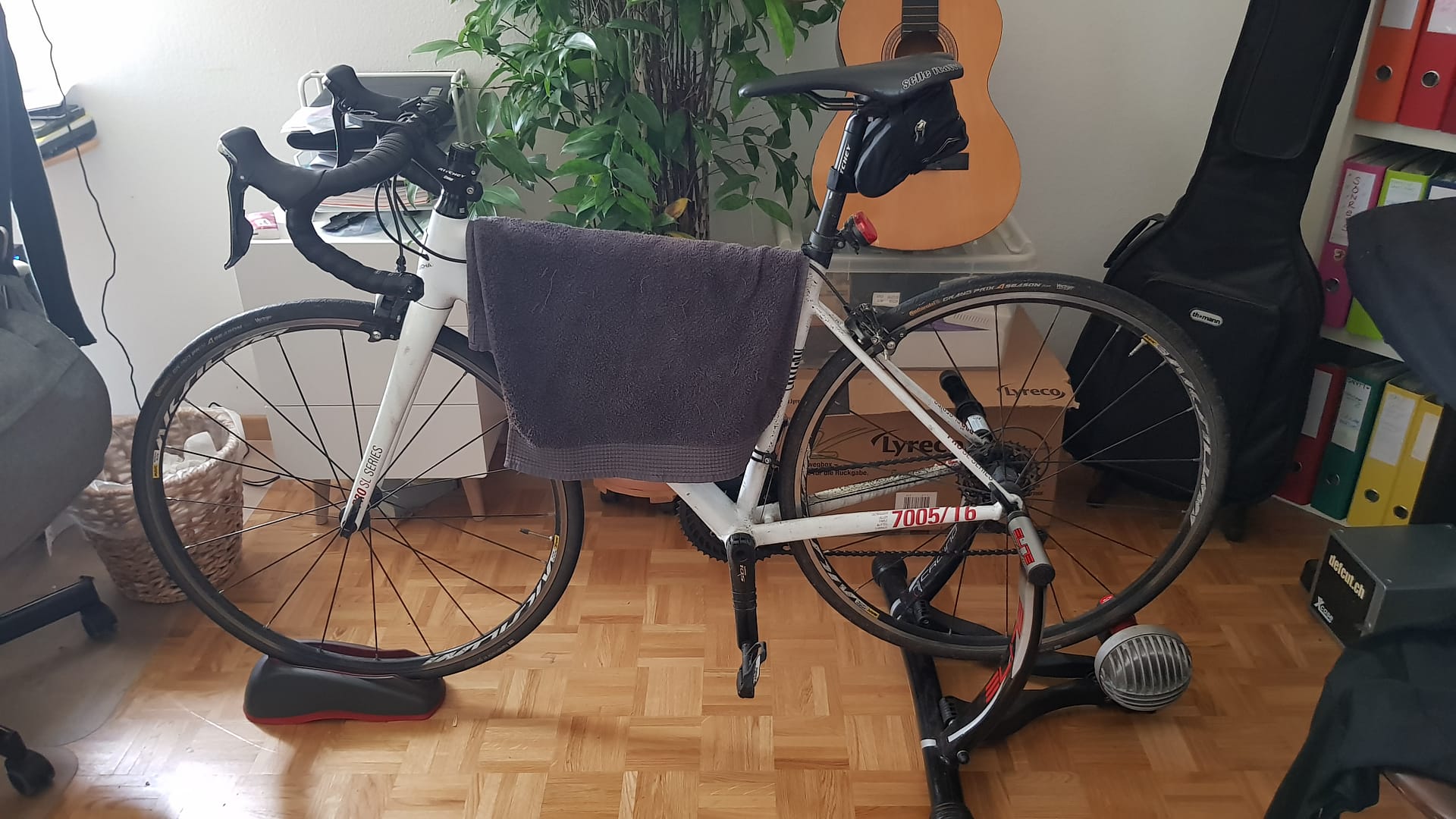 Zusätzlich zum Trainer, habe ich auch so eine Art Ständer für das Vorderrad bekommen. Damit ist das Vorderrad auf der selben Höhe wie der Rest des Rades wenn man das Fahrrad eingespannt hat. Hier mal ein Bild wie das aussieht wenn das Rad auf dem Rollentrainer ist. Danach muss man sich nur noch drauf schwingen und lostreten.