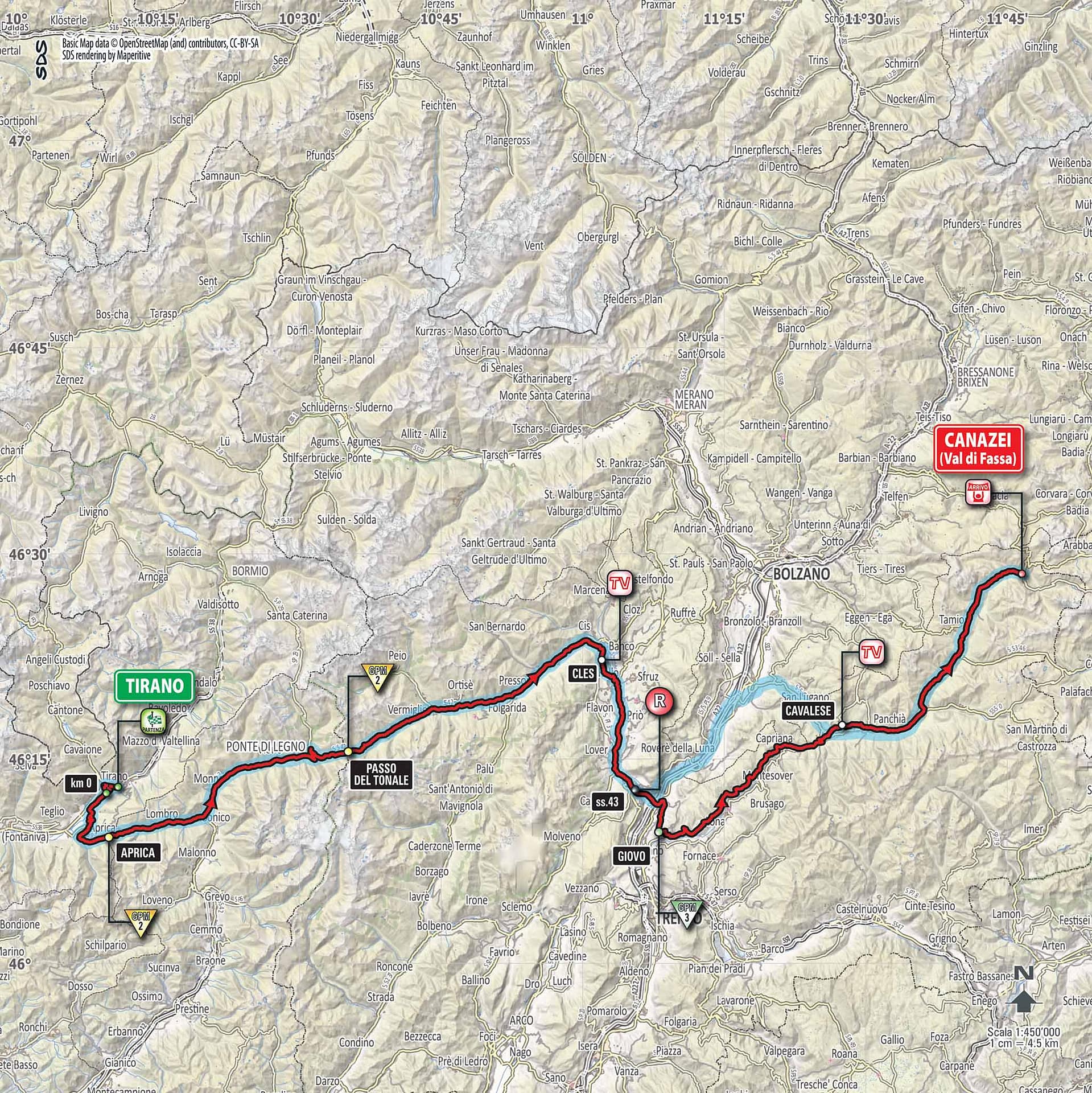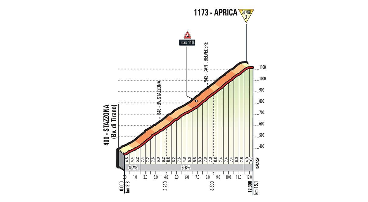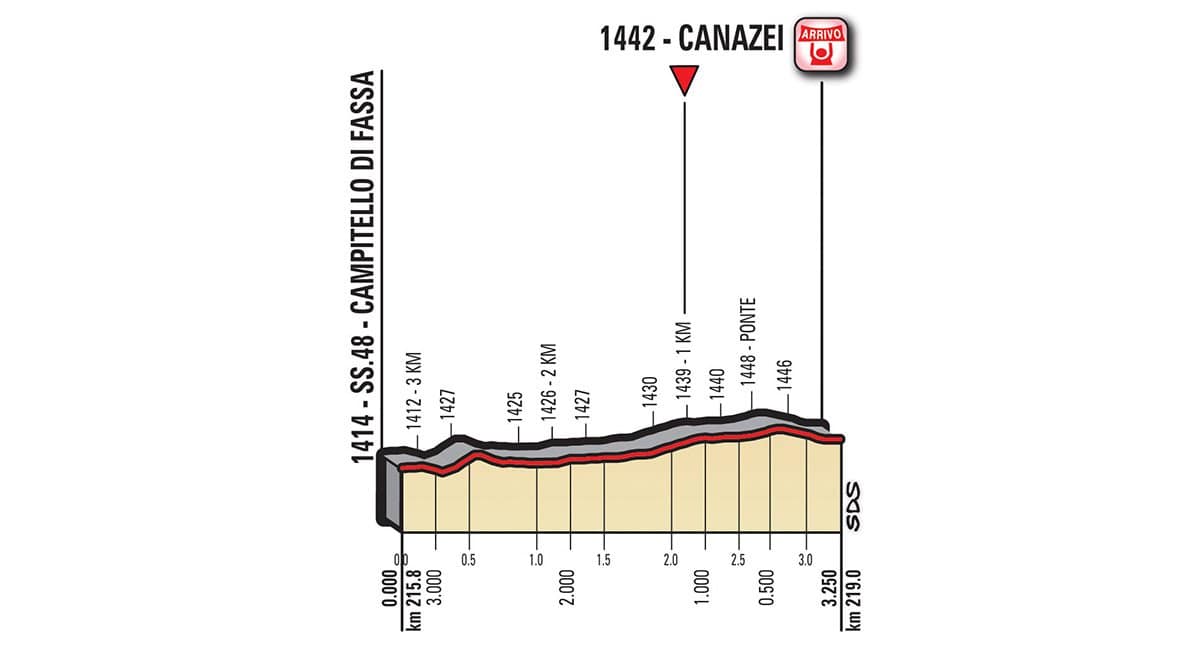 Die heutige Etappe Nummer 17 beginnt in Tirano und endet nach 219 Km in Canazei. Die Etappe beginnt um 11.15 Uhr. Bereits nach 2.09 Km geht es an den Aufstieg nach Aprica. Die Steigungen liegen zwischen 4.1 und 6.9%. Danach geht es etwa für 15 Km wieder runter bevor es über den Passo del Tonale oder einfach den Tonalepass auf Deutsch. Beim Tonalepass warten Steigungen zwischen 4.1 und 6.3% auf die Fahrer. Der dritte und letzte Aufstieg dieser Etappe kommt nach ca. 131 Km und ist etwa 8.1 Km lang. Die Steigungen die bezwungen werden müssen bewegen sich zwischen 8.5 und 6.9%. Die letzten 5 Km bevor man in Canazei ankommt werden auf einer sehr breiten Strasse mit stetiger moderater Steigung gefahren.