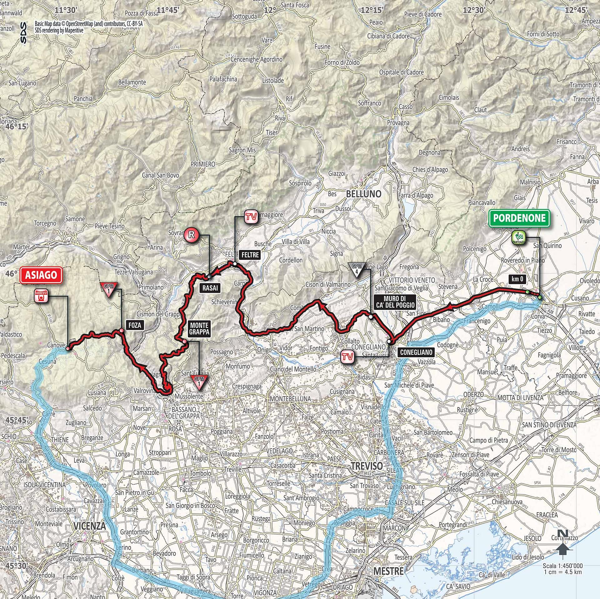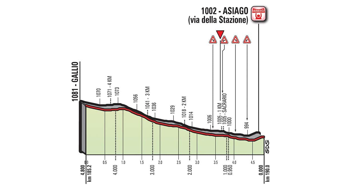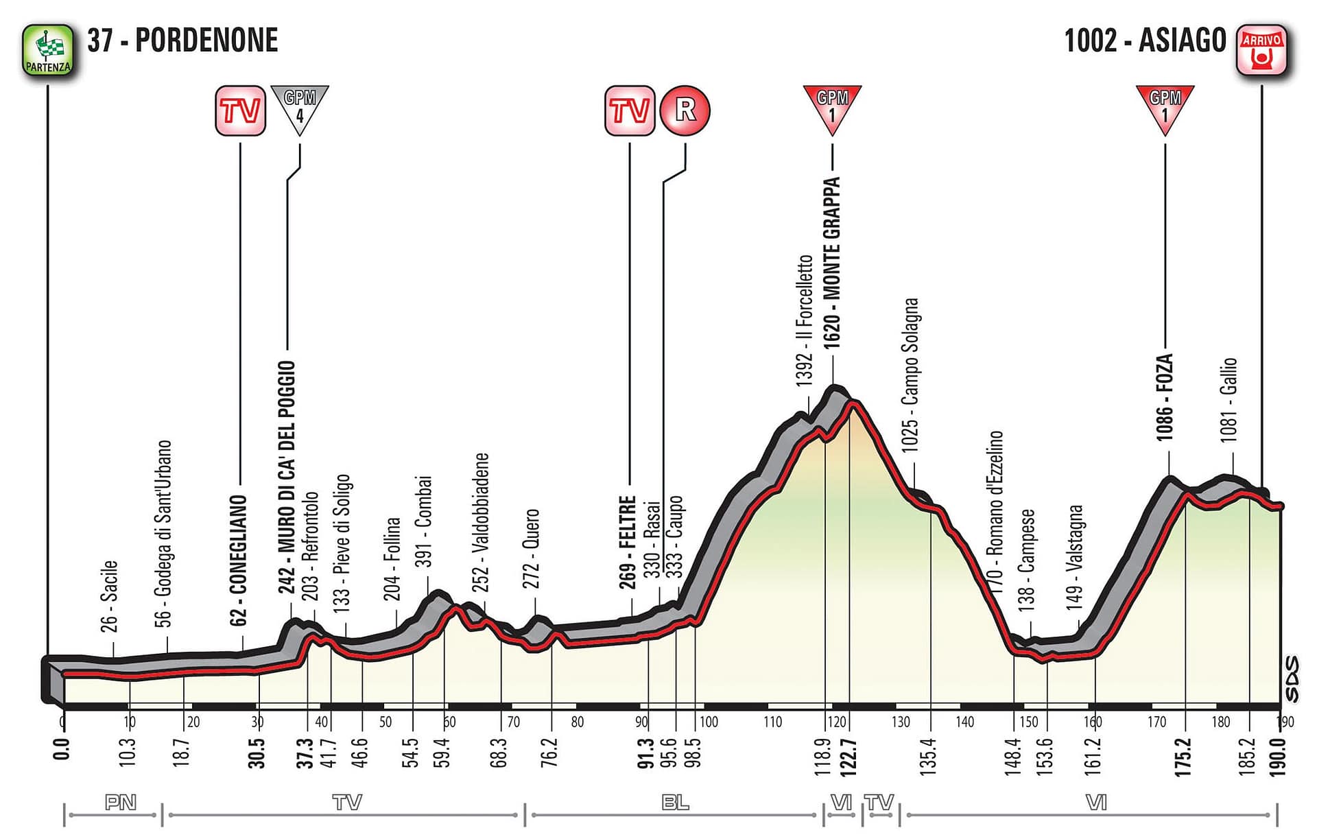 Heute beginnt die zweitletzte Etappe des Giro d’Italia. Die Etappe Nummer 20 beginnt um 11.55 Uhr in Porderone und endet nach 190 Km in Asiago. Porderone ist die Hauptstadt der gleichnamigen Provinz und liegt in der Region Friaul-Julisch Venetien. Das Gebiet wurde schon vor dem Jahr 1000 bewohnt. Pordenone hat eine malerische historische Altstadt und von da startet auch die Etappe wie bereits sechsmal zuvor bei einer Giro Ausgabe. Die ersten 100 Km sind, abgesehen von dem Anstieg auf den Muro di Ca del Poggio, recht flach. Die Steigung auf den Muro di Ca del Poggio ist lediglich 1.15 Km lang hat es aber, mit 16 bis 19% Steigung, richtig in sich. Die nächste Steigung ist danach der Monte Grappa. Der Monte Grappa ist mit 1775 Metern. die höchste Erhebung des Grappastocks, der südlichsten Gruppe der Dolomiten. 24.150 Km lang und mit Steigungen zwischen 5.9 und 11% sind zu meistern. Danach geht es auf einer technisch anspruchsvollen Strecke wieder runter auf 138 Höhenmeter. Dabei kommt man an den Orten Campo Solagna, Romano d’Ezzelino oder Campanese vorbei bevor in Valstagna der Aufstieg auf den Asiago kommt. Der Anstieg is 14.05 Km lang und hat Steigungen von 4.2 bis 11%. Oben angekommen haben die Fahrer 175.2 Km absolviert und es bleiben noch 14.8 Km bis zum Ziel in Asiago.