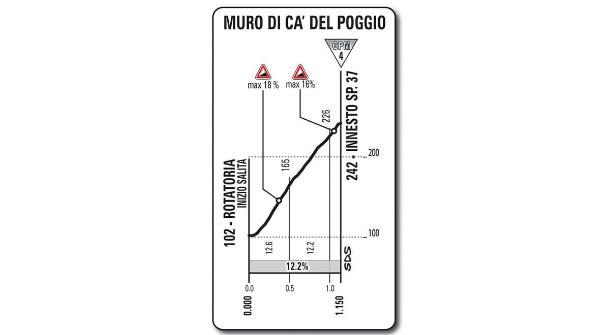 Erster Anstieg Etappe Nummer 20 auf den Muro di Ca del Poggio