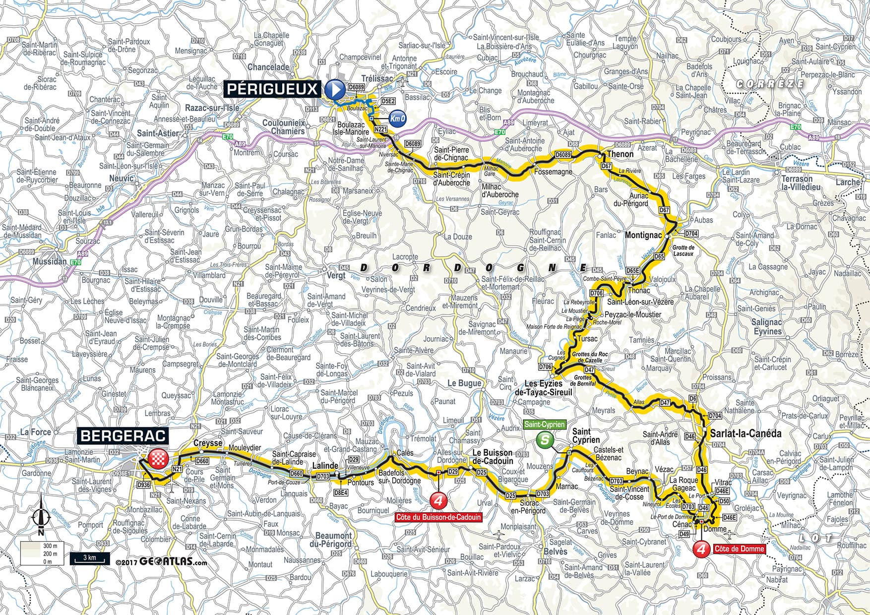 - Nach 100.5 KM Côte de Domme: 3.5 KM Anstieg mit durchschnittlich 3.3% Steigung